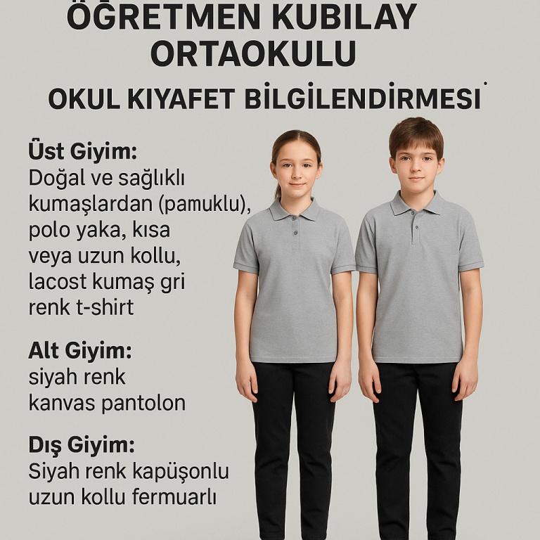 2025-2026 eğitim-öğretim yılında okul kıyafetlerinde herhangi bir değişiklik yapılmamıştır. Geçtiğimiz yıllarda olduğu gibi aynı kıyafet düzeni uygulanacaktır.